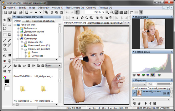 Hornil StylePix - программа, позволяющая ретушировать фотографии, изменять их размер, повернуть, провести цветокоррекцию, наложить текст, сделать фотоколлаж, вырезать, копировать и вставлять фотографии, применять различные фильтры, удалять эффект красных глаз и многое, многое другое. И это бесплатно. Имеет интуитивно понятный пользовательский интерфейс. Он предназначен для легкого и удобного управления отдельными функциями.