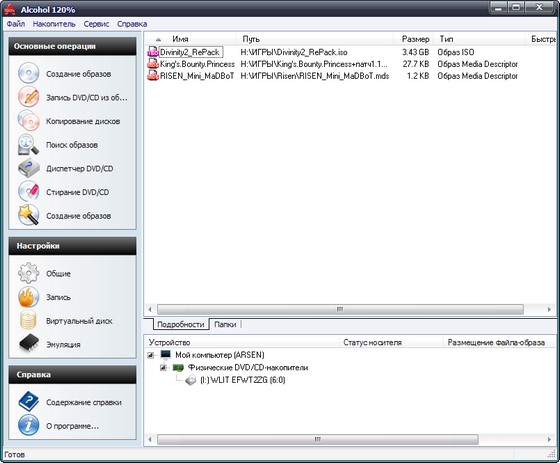Alcohol 120% - эмулятор CD/DVD-дисков. Программа создает на жестком диске ПК пользователя образ диска с данными, аудио или видео информацией, а затем предоставляет доступ к этим данным другим программам так, словно искомый диск находится в приводе. Alcohol 120% поддерживает работу со многими форматами CD/DVD, имеет возможность работы с 31 образом одновременно, обеспечивает несоизмеримо большую (по сравнению с CD) скорость передачи данных между приложением и образом диска. Alcohol 120% может работать с большинством известных файлов-образов, эмулирует работу 200х скоростного CD-ROM, есть поиск образов, еще одна положительная черта - программа может копировать защищенные диски, обходить защиту SafeDisc, StarForce (частично), Securom и LaserLock.