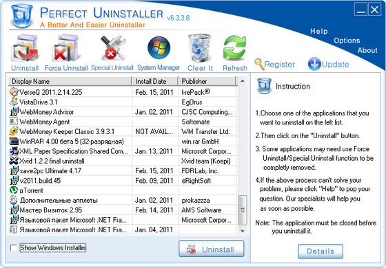 Perfect Uninstaller - программа для тщательного удаления программного обеспечения, которые нельзя удалить с помощью стандартного диалога удаления и установки программ Windows. С этой программой вы сможете удалять ненужные приложения в вашей системе быстрее и легче. Стандартный диалог установки и удаления программ часто не может удалить определенные приложения или сломанные ключи реестра, в отличие от данной утилиты, программа не только позволит вам удалить приложения, но и очистит ваш ПК от поврежденных записей в системном реестре, улучшая производительность и скорость вашей системы. Кроме того, с помощью этого приложения вы сможете узнать детальную информацию о том, какие файлы и записи реестра затронула установка той или иной программы.