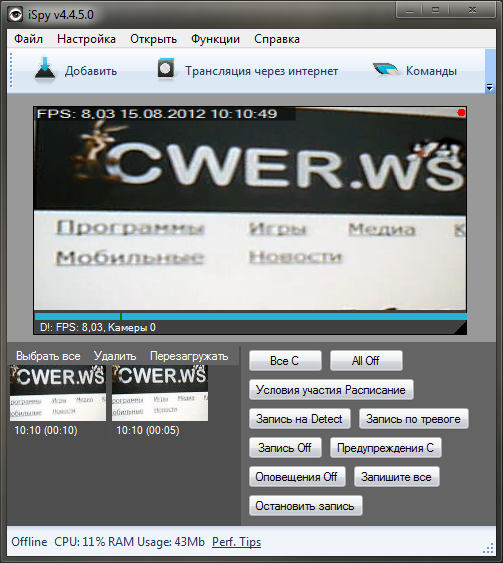 Кроме того, iSpy позволяет просматривать онлайн (в режиме реального времени) или сохраненное видео через интернет или мобильные устройства. Все данные сжимает и сохраняет в формате flash video. Есть возможность работать на нескольких компьютерах сразу, а также контролировать программу удаленно, защищать ее паролем, делать группы или присоединяться к существующим группам (на сайте разработчика) и давать доступ участникам группы к вашим веб-камерам и микрофонам.