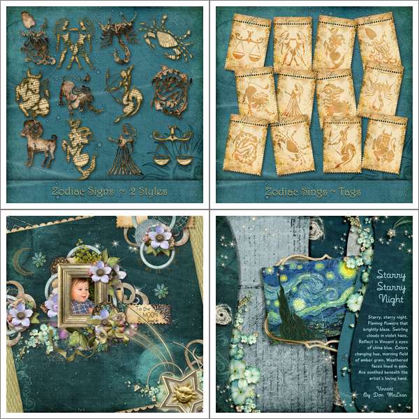 В скрап-наборе Starry Starry Night представлены все знаки зодиака, цветы, ленты, фоторамки, фоновая бумага и другие винтажные элементы.
