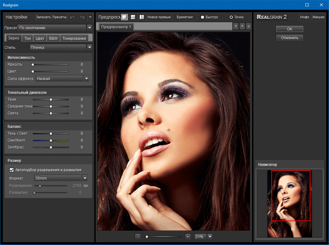 Средства управления RealGrain для баланса детализации, настройки цвета и тона, обеспечивают превосходное качество конечного продукта, просты и удобны в использовании. Кроме того, в RealGrain входят точные предустановки для ряда опций по умолчанию. Вы можете установить собственную последовательность работы, отвечающую вашим индивидуальным требованиям.