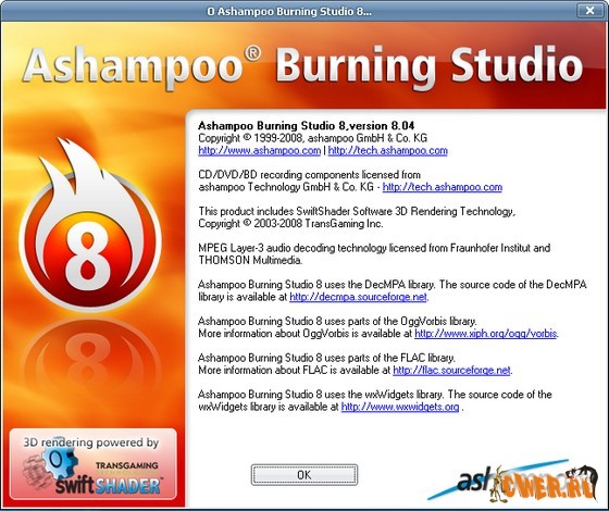 Ashampoo Burning Studio - пакет программ для записи CD-RW, DVD-RW, DVD+RW и Blu-ray дисков. Утилита позволяет создавать проекты и записывать CD/DVD (в том числе MP3-CD, VCD, S-VCD и Blu-ray). Программа поддерживает длинные имена файлов (127 знаков для DVD и Blu-ray и 64 для CD), автоматическую настройку параметров, сохранение и загрузку проекта, создание образов, простое управление файлами с помощью Drag&Drop и многое другое. Работает совместно с большинством записывающих устройств. Новая линия Ashampoo Burning Studio 8 сохранила все преимущества 7-ой линии и добавила новые возможности и усовершенствования. Ashampoo Burning Studio 8 имеет улучшения в создании DVD-видео, ряд возможностей для редактирования копий, функции изменения файловой системы диска, а также улучшены возможности резервного копирования файлов и риппинга аудио-CD.