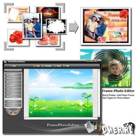 Frame Photo Editor - программа для работы с цифровой фотографией. С её помощью Вы можете легко сделать коллаж, совместив свое фото с другой картинкой или фотографией, вставить фото в изящную рамку. Вы можете легко изменить размер и положение фотографий или текста, стоит только кликнуть и переместить их. Отредактировав фото с Frame Photo Editor, Вы сможете напечатать их, послать по электронной почте или установить как обои для рабочего стола.
