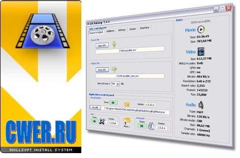 AVI ReComp - позволяет повторно сжимать ваши файлы AVI. Программа поддерживает не только файлы, содержащие аудио потоки, но также и AVI без аудио. Для пережатия пока используется только XviD кодек. AVI ReComp будет необычайно полезен тем, кто захочет очистить AVi от GMC(Глобальной Компенсации Движения) или Qpel (функция, предназначенная для просчёта движения пикселов с точностью до 1/4 пиксела) для подготовки видео к просмотру на автономных DVD плеерах. AVI ReComp обладает возможностью вложения субтитров в видео и конвертацией AVI в AVI, AVI в XviD, DivX в XviD, XviD в XviD.
