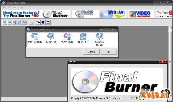Программа для записи CD/DVD дисков. Несмотря на то, что программа бесплатна и имеет относительно маленький размер, в ней есть все функции, необходимые рядовому пользователю. С помощью FinalBurner можно записать диск с данными, создать CD-аудио и DVD-видео диски, а также сделать ISO-образ диска. Для записи CD-аудио подходят многие музыкальные форматы (WAV, MP3, OGG, WMA, MID и т.д.), которые свободно импортируются при добавлении их в проект. Не менее полезной возможностью является импортирование видео файлов (AVI, MPEG4, MP4, MPG, WMV, ASF, MOV) для создания своих DVD-видео дисков.
