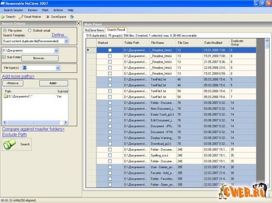 Noclone 2007 Enterprise - программа для поиска и удаления дубликатов файлов на отдельном компьютере или в локальной сети. За считанные минуты даная программа обнаружит все дубликаты на жестком диске. Сравнение файлов происхоит не через CRC, а побайтово. В зависимости от степени вашей решимости проводить генеральную уборку можно назначать поиск файлов по побайтовому сравнению, по названиям или просто по «внешней» схожести. Программа может проводить поиск повторяющихся файлов любого формата, от библиотек DLL до файлов формата MP3. Если процедура поиска занимает много времени, ее можно продолжить в следующий раз, сохранив результаты текущей сессии в формате CSV.