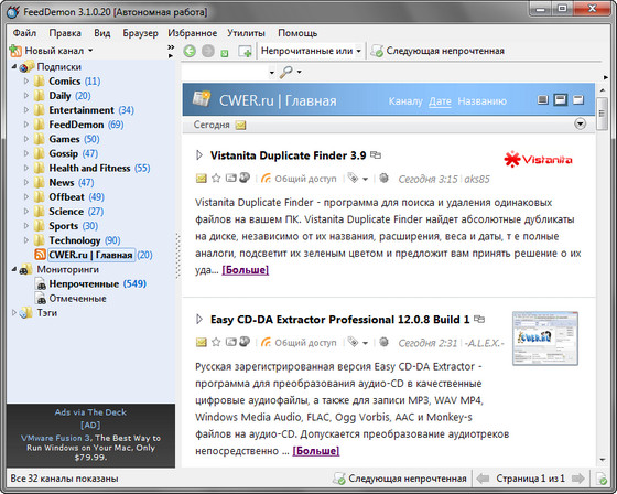 FeedDemon - одна из самых популярных программ для получения новостей с сайтов по технологии RSS и XML. По сравнению с обычным просмотром сайтов с помощью браузера, технология RSS имеет два существенных плюса - возможность практически полной автоматизации и значительное уменьшение объема скачиваемых данных за счет отсутствия в получаемых новостях рекламы.