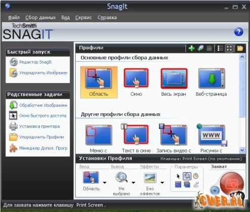 Основное назначение программы - снятие скриншотов с экрана монитора, причем SnagIt умеет делать не только статичные графические "снимки" выбранной области, но и, например, записать в видео то, что происходит на экране, а также захватить картинку из приложений, использующих Direct X, DirectDraw и Direct 3D.