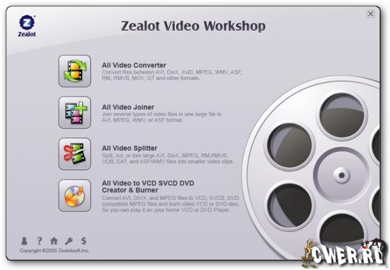 Zealot Video Workshop - это конвертер видео файлов различных форматов, нарезка и соединение видео файлов, создание и запись видео CD, DVD. 4 утилиты в одном "флаконе": All Video Converter, All Video Joiner, All Video Splitter и All Video to VCD SVCD DVD Creator & Burner.