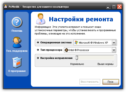PCMedik - это небольшая программа, предназначенная для настройки параметров и оптимизации работы операционных систем Windows, позволяет уменьшить количество зависаний, "падений" и т.д. Вся работа с программой осуществляется посредством простого интерфейса. Требуется лишь указать операционную систему (Windows XP, например), производителя процессора (Intel, AMD, другой) и выбрать, что необходимо сделать: "вылечить" или "вылечить и оптимизировать". После применения PCMedik может заметно возрасти скорость работы приложений в среде Windows.